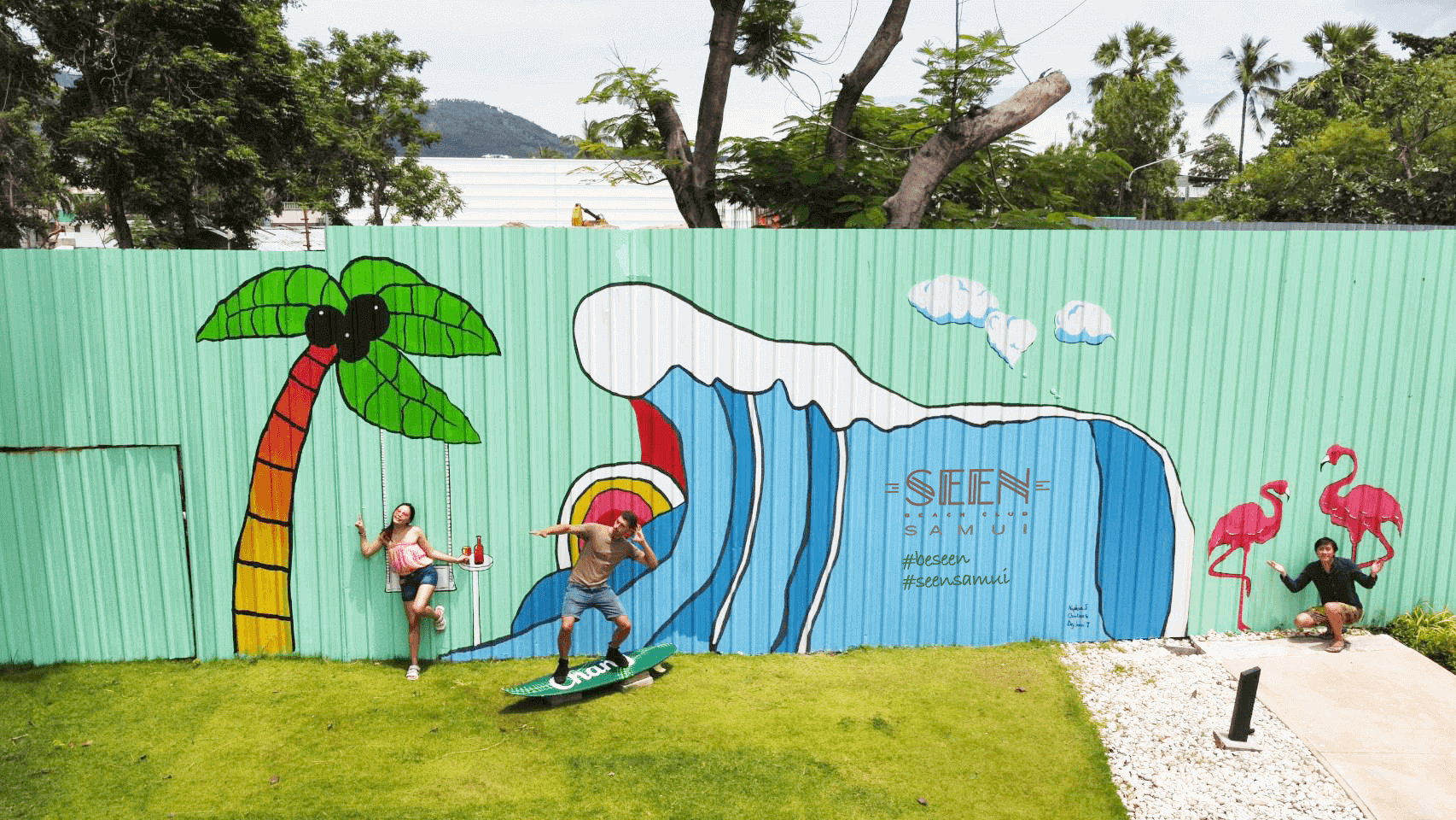 During the construction of a new hotel next to the club, the view shield should not distract from the club’s beauty. With that in mind we created a painting on it, which extends the club’s art gallery while being attractive for guests to take pictures in front of it and even promoting the club online through shares.